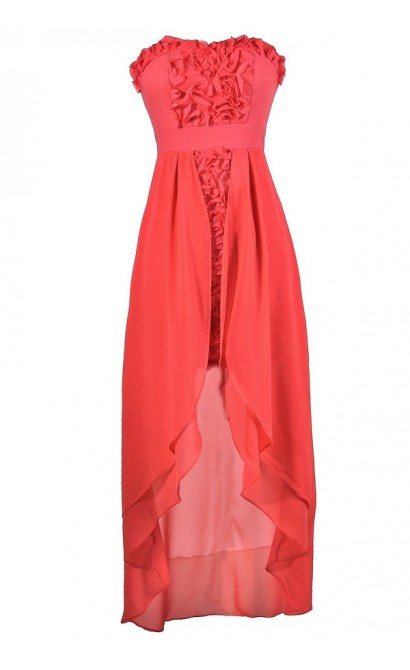 Romantic, dramatic, and ethereal perfectly describes this high low dress with textured fabric rosettes at the front. The Bed of Rosettes Textured High Low Dress has a strapless sweetheart neckline with a lightly padded bust for support. The underneath is made of a substantial fabric with a bit of stretch to it. It has a banded empire waist and fitted cut. A panel of textured rosette fabric down the front adds a girly touch. Chiffon fabric at the waistline continues down, creating a dramatic high low cut. A hidden back zipper completes this look. The Bed of Rosettes Textured High Low Dress in Beige would look nice paired with nude pumps or strappy heels and a clutch. This dress is perfect to wear to any upcoming dance or semi-formal event.