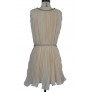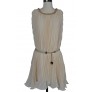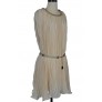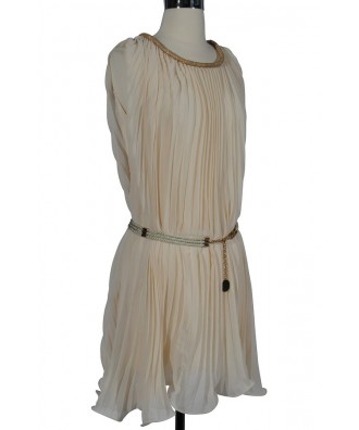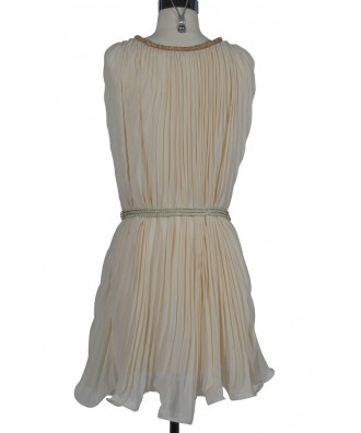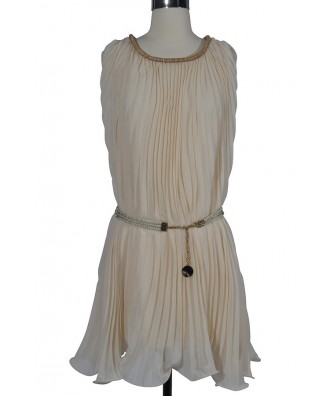 This dramatic and unique dress is crafted of a gorgeous cream pleated chiffon fabric and has a cool beaded rope trim detailing at the neckline. The included triple-strand rope belt has a large gold charm on it, and can be worn several different ways. The Cream of the Crop Pleated Chiffon Belted Dress is fully lined and has a loose, drapey overlay of semi-sheer pleated chiffon fabric. The flouncy fabric will float and flutter in the breeze—this is the perfect unique party dress for the upcoming holiday season! Add on the included belt with a gold charm and you’ll create a fashion-forward look everyone will love. This beautiful dress would be perfect paired with cream or neutral pumps or strappy heels and a cute clutch purse. Fully lined. Belt included. Small measurements: Length from top of shoulder to hemline: 34-36”.