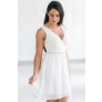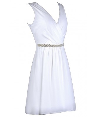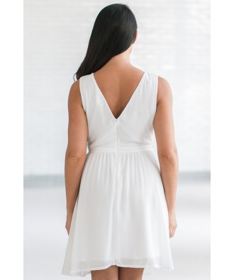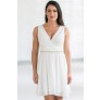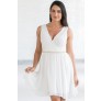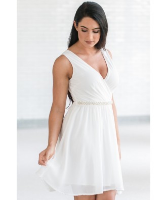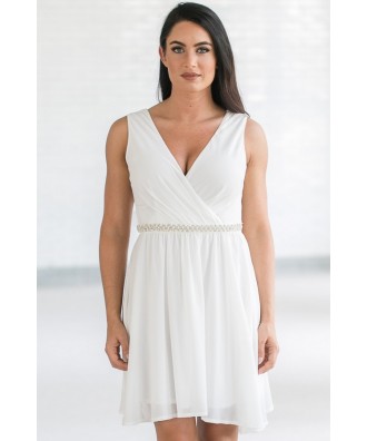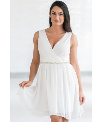 This pearl embellished chiffon dress would make a cute bridesmaids dress--the ivory version would be perfect as a rehearsal dinner or bridal shower dress as well! The Delicate Balance Pearl Embellished Dress is fully lined and made of chiffon. It has a crossover surplice neckline, wide shoulder straps, and a flowy skirt. A band of pearl and rhinestone embellishments at the waist adds a touch of sparkle to this look. A hidden back zipper completes this dress. We love how this dress has a simple flattering cut that works for so many events. Pair it with beige pumps or strappy heels and a clutch.