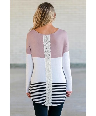 This is a cute and casual top that is perfect to wear on game day! It is also great to pair with leggings while running errands. The Game On Colorblock Stripe Longsleeve Tee is made of a comfy knit fabric. It has a rounded neckline, long sleeves, and a longer length cut. This top features alternating color blocks of fabric and stripes at the bottom hem. A vertical band of crochet at the back completes this look. Pair this top with denim, black leggings, or palazzo pants for a comfy casual look.