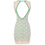 This flirty lace dress will have all eyes on you. The Go Green Lace Dress with Fabric Piping is fully lined in bright green fabric with beige lace overlay on top. A V neckline and green fabric piping on each side of the dress combine to create a lovely silhouette. The open back will make a statement whether you are coming or going. An invisible back zipper completes this dress. The Go Green Lace Dress with Fabric Piping is perfect for your next night out with friends or with someone special. It would be perfect paired with nude or beige pumps or wedges. Fit note: This dress runs very small; consider sizing up. Details: Made in USA. Fully lined. Invisible back zipper. 95% nylon, 5% spandex. Lining: 100% polyester. Dry clean only. Small measurements: Length from top of shoulder to hemline: 37”. Bust: 34”.
