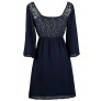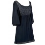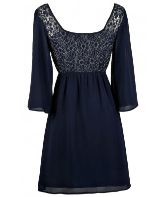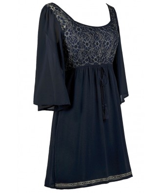 This dreamy, ethereal navy and gold dress reminds us of celestial skies! We love the boho hippie chic vibe of this dress. The Moon Goddess Navy and Gold Dress is made of navy chiffon. It has a rounded neckline, empire waist, and a flowy cut. A navy panel of lace at the bust and top back is embellished with gold metallic threading, adding a touch of shine. The chiffon sleeves of this dress have an oversized flowy cut and are unlined and semi-sheer. The elasticized empire waist is decorated with a rope tassle that ties into a bow. The Moon Goddess Navy and Gold Dress can be dressed down with beaded flat sandals or gold gladiator sandals and a gold boho headpiece. You could also dress it up with wedges or pumps. We absolutely love the bohemian style of this unique dress!