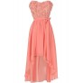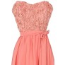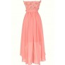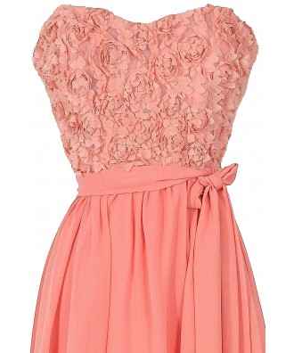 This lovely chiffon dress has a strapless sweetheart neckline with boning at the bust. The bust is fully lined and made of sheer mesh with 3-dimensional floral appliques throughout. The empire waist gives way to the chiffon high low skirt that is lined to the mid-thigh. A fabric sash wraps around the waist and can be tied into a bow or left to hang. A hidden back zipper completes this dress. The Rosette Romance Designer High Low Dress would look great paired with pumps or strappy heels and a clutch. Also available in Ivory.