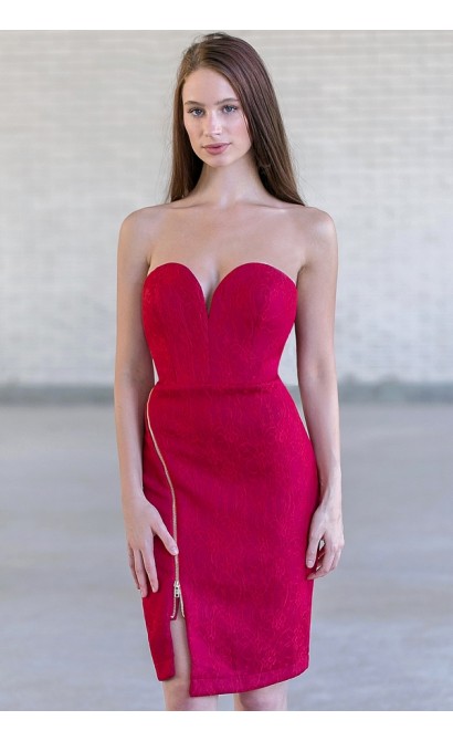 FINAL SALE. Are you wild at heart? Fall in love with the Wild At Heart Lace Strapless Dress. This gorgeous dress is fully lined and made of a thick lace patterned fabric. It has a sweetheart neckline with structured boning and a padded bust. It is strapless with a classic sheath cut. The most unique detail of this dress is the exposed gold side zipper. This can be unzipped as little or as much as you want, creating a sexy look! A hidden back zipper completes this dress. This strapless lace dress is perfect for a Holiday party or Valentine’s Day! You’ll make hearts go wild in this gorgeous dress! Pair with simple jewelry and heels.